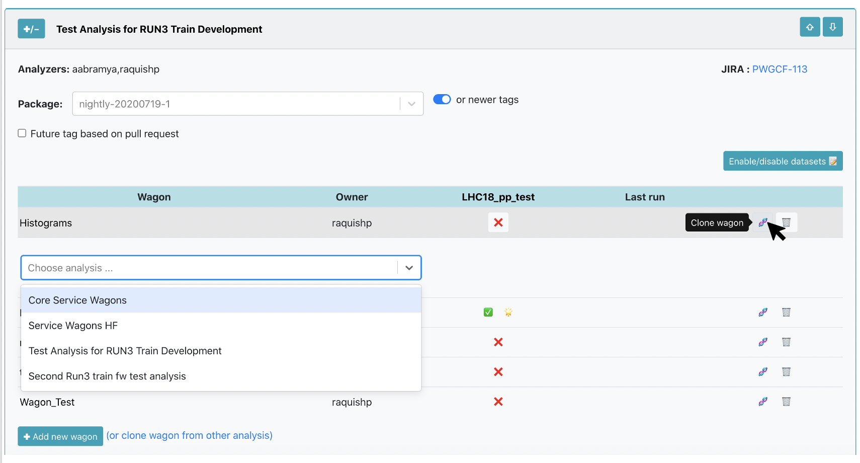 Clone. When cloning a train, the wagons and dataset configuration used will be the same as of the original train. Other settings can be changed: package tag, target facility, slow train, derived data, automatic submission.