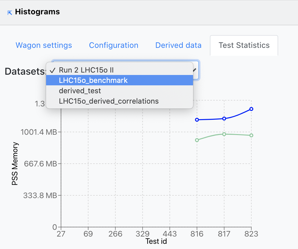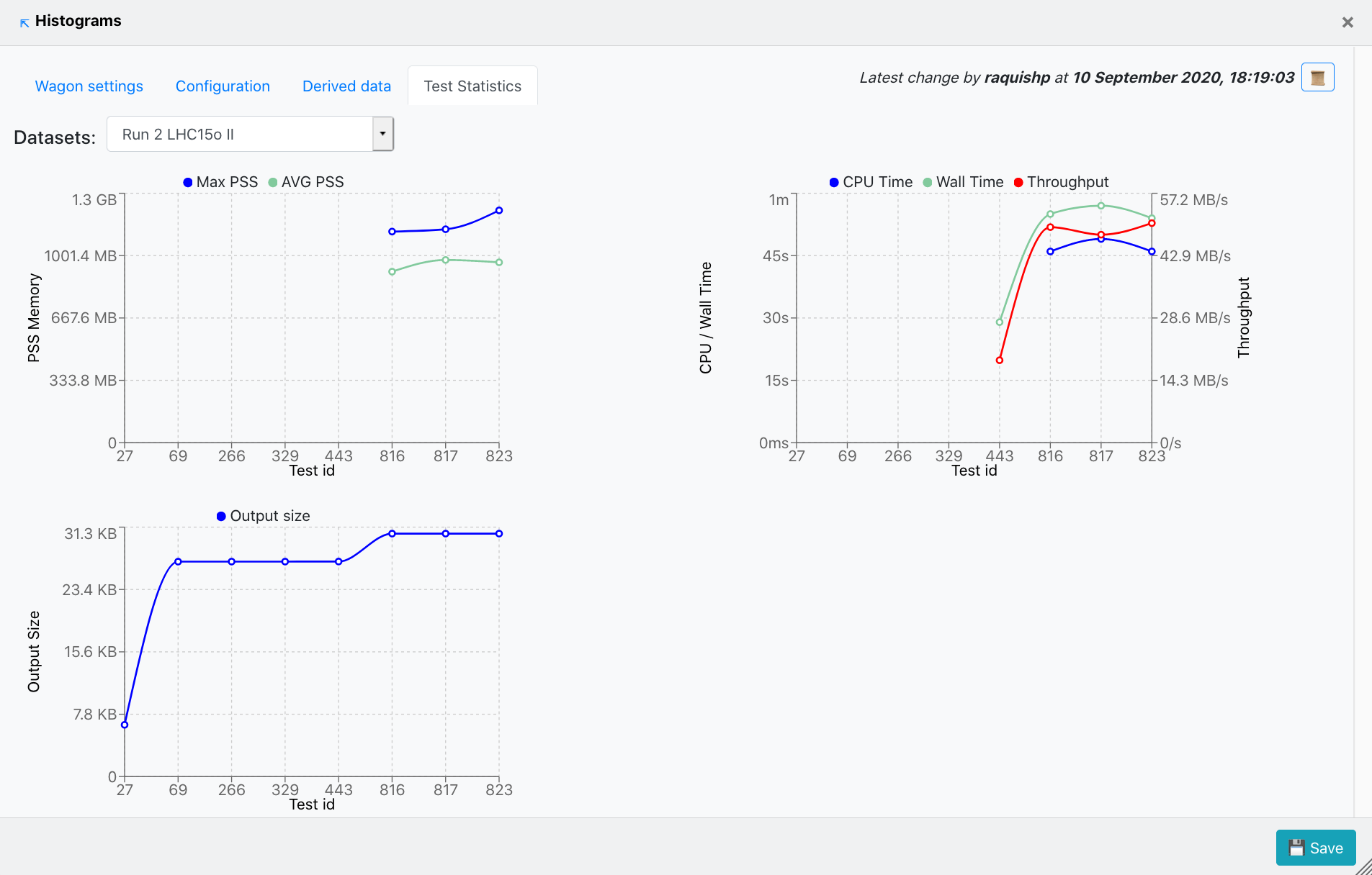 - Test Statistics contains three graphs that display different metrics following the tests this wagon was part of. The first graph plots the PSS Memory corresponding to each test run. The second one diplays the CPU Time, Wall time and Throughput along the test runs for this wagon. Finally, the third graph shows the Output size at each test run.
