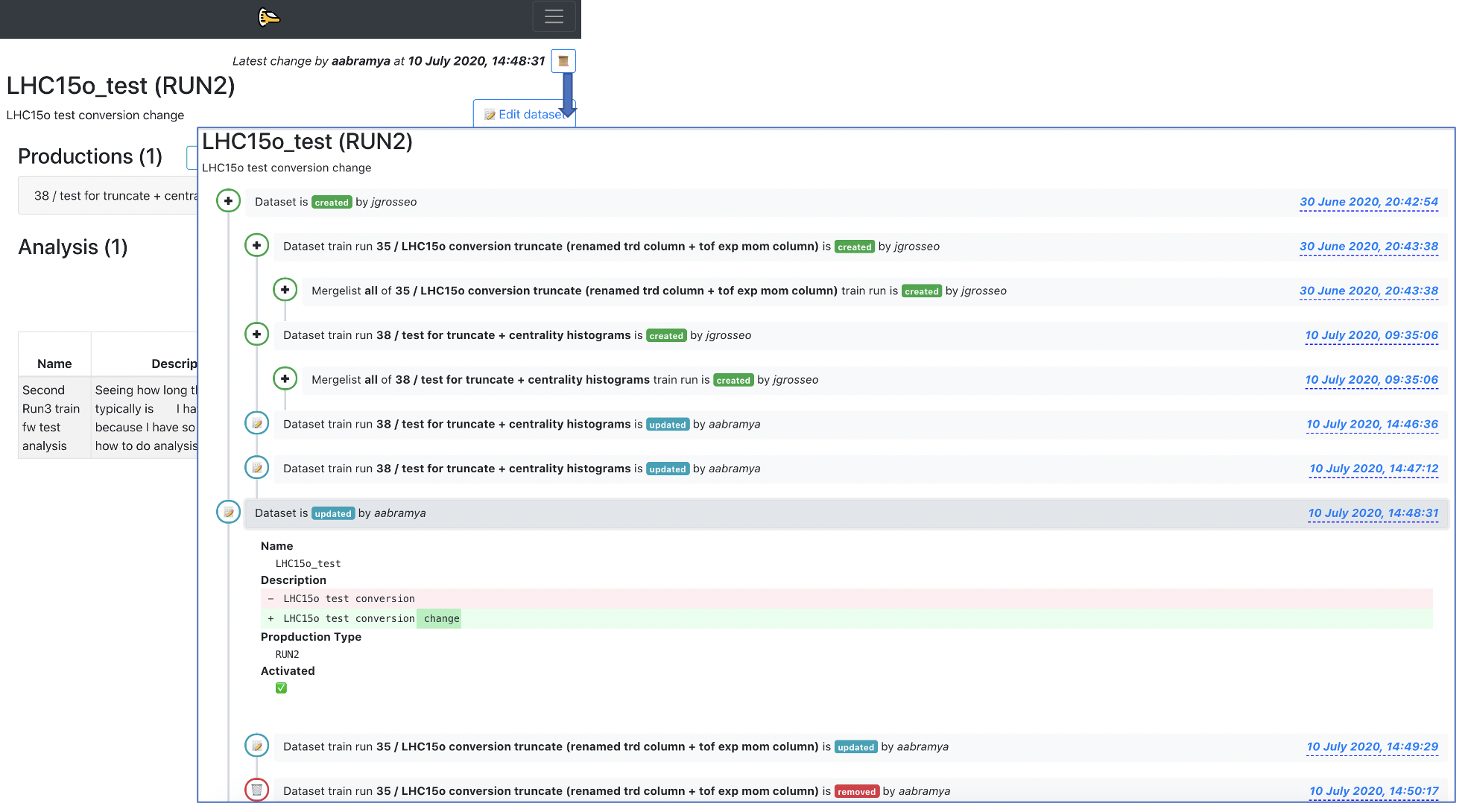 📜available inside of a wagon/dataset view. A detailed view of what has been created/updated/removed from the wagon/dataset is shown, as well as the username and the time when the change was made.