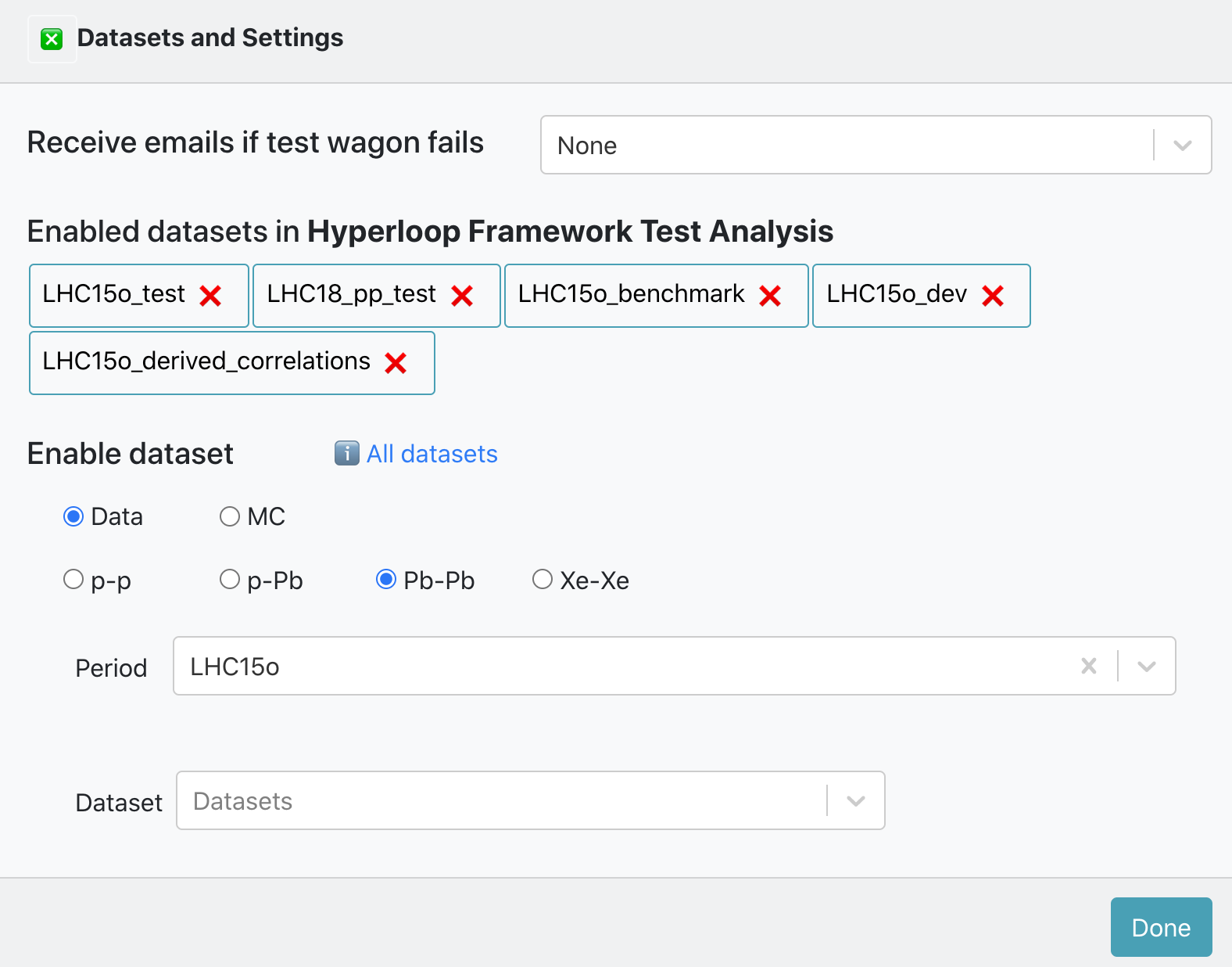 ❌. - Inside of Enable dataset you can search for an active dataset by filtering by data type, collision system, anchor and period. And add it to your analysis by clicking on the button