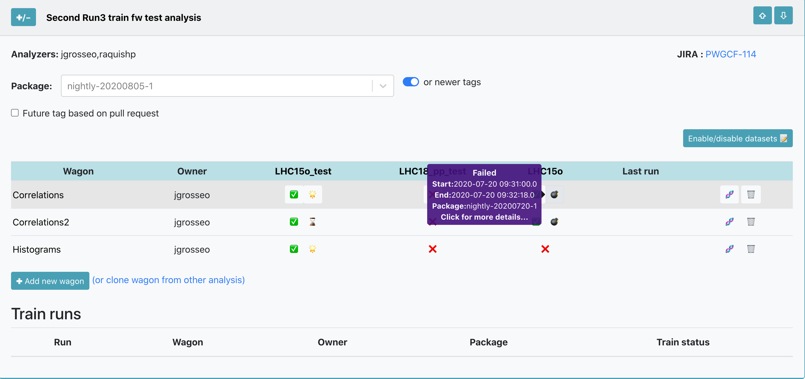 - Trains are composed per dataset. Only wagons which have a test status of success