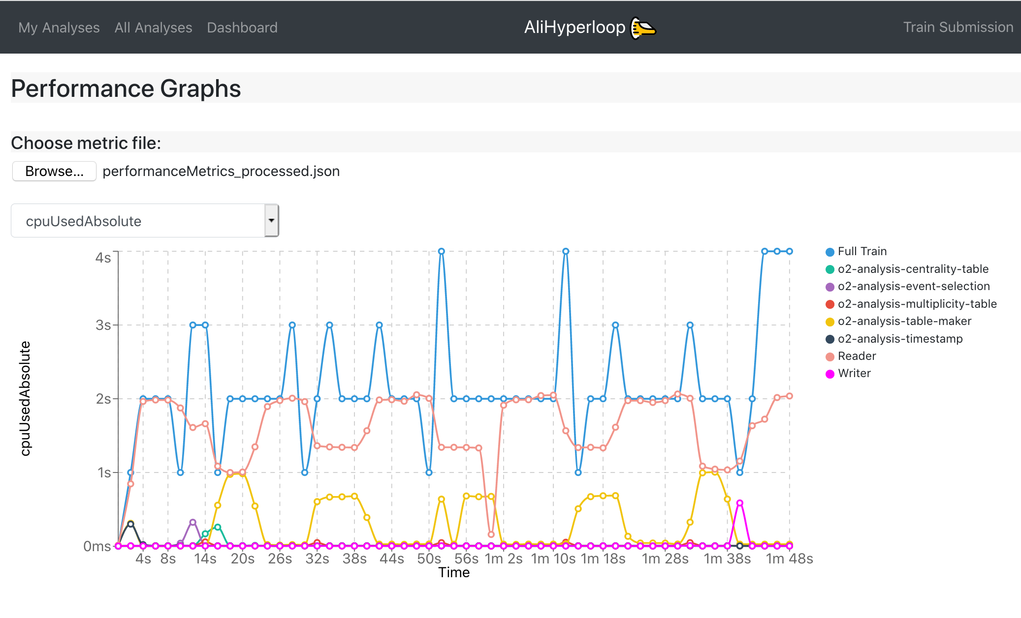 Performance Graphs page allows the user to upload his own local metrics file, and then generate the test graphs specific to that file. You produce a local performanceMetrics.json by running the o2 workflow with the argument –resources-monitoring 2 which, in this example, produces monitoring information every 2 seconds. These are the same type of graphs produced in the Test Graphs tab of the train run. This page can be accessed at: https://alimonitor.cern.ch/hyperloop/performance-graphs.