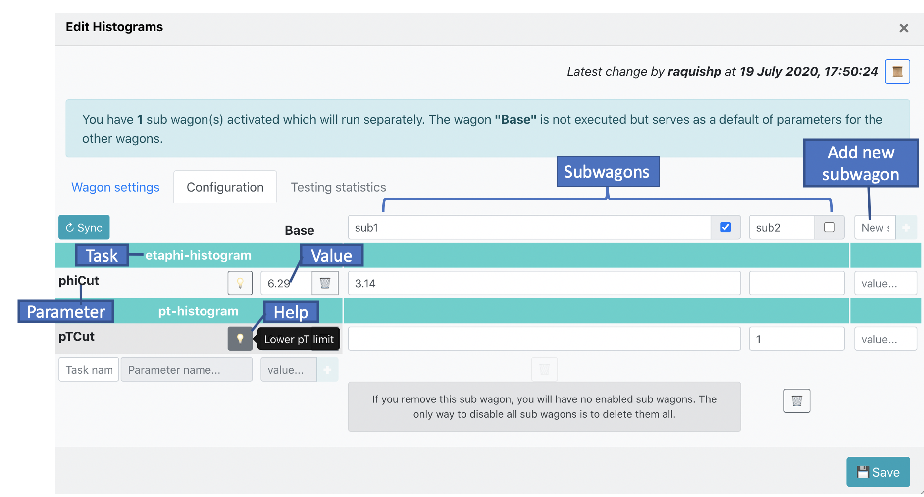 If you need to run the same workflow, but modify one (or more) of the parameter's value, you can use a subwagon instead of creating a new wagon. In order to create a subwagon, type the name of the new subwagon, the name has to be unique within the wagon, and type the value of at least one parameter in the configuration. The configuration of a subwagon will be kept the same as the Base and overwrite the parameters that are different. When there are subwagons activated, the wagon's Base will not run. NOTE: subwagon submission is at present not yet supported, but will come soon.